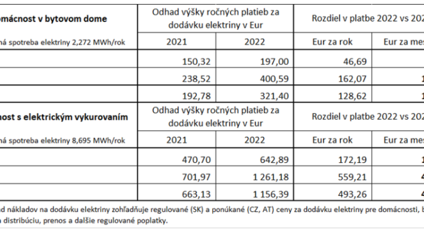 Slovenská domácnosť v bytovom dome so spotrebou elektriny 2,272 MWh za rok zaplatí podľa odhadu tento rok za dodávky elektriny zhruba 150,32 eura. Rovnaká česká domácnosť zaplatí za rok 2021 o vyše 88 eur viac ako slovenská. Rakúska domácnosť si priplatí o vyše 42 eur viac v porovnaní so slovenskou.