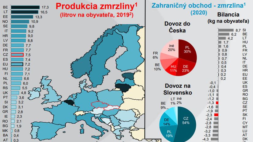Naopak, Slováci („priemyselnú“) zmrzlinu nevyrábajú a pravdepodobne nepatria ani k jej veľkým fanúšikom – údaje zahraničného obchodu naznačujú, že na obyvateľa sa jej ročne na Slovensko dovezie len niečo viac ako 2 kg na osobu (v prepočte približne 4– 4,5 litra na osobu), t.j. jej spotreba je výrazne pod priemerom EÚ, približne len polovičná.