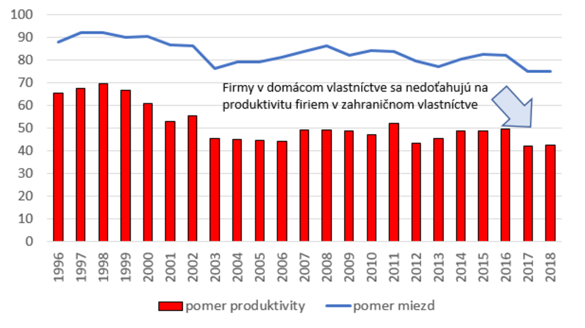 Vysvetlivky: Stĺpce zobrazujú, akú produktivitu práce dosahujú v priemysle SR podniky v tuzemskom (domácom) vlastníctve v pomere k produktivite firiem, ktoré sú v zahraničnom vlastníctve. Čiara zobrazuje, akú priemernú mzdu v priemysle SR vyplácajú podniky v tuzemskom vlastníctve v pomere k mzdám vyplácaným podnikmi v zahraničnom vlastníctve.