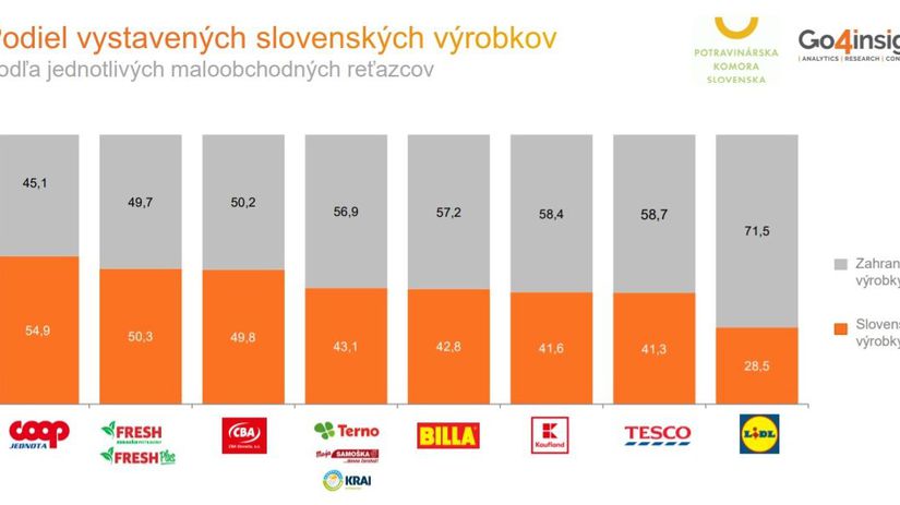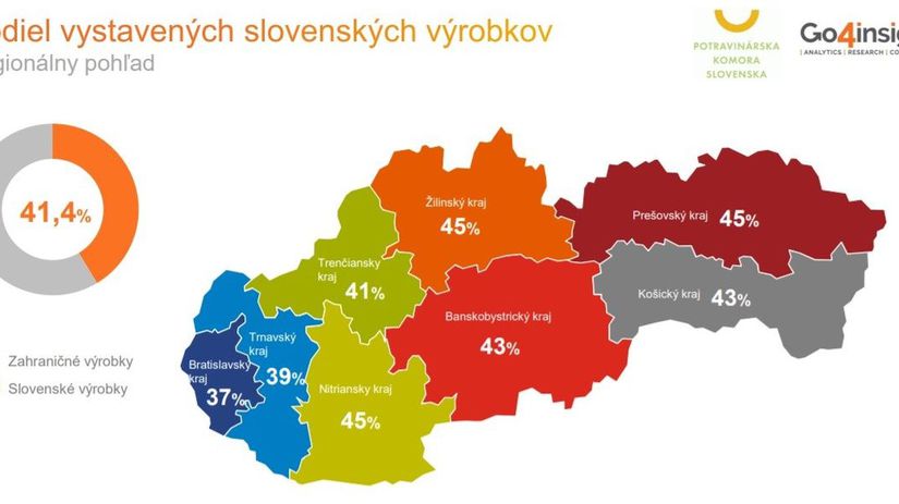 Najviac vystavených slovenských potravín majú malé predajne (54 percent), potom supermarkety (47 percent), hypermarkety (41 percent) a diskonty (28 percent). Platí tiež, že čím bohatší kraj, tým menší výstav slovenských potravín – Bratislavský 37, Trnavský 39, naproti tomu Prešovský a Nitriansky po 45 percent. Ostatné kraje sú nad 40 percentami.