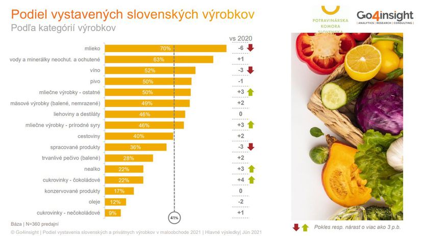 Česť slovenských výrobkov zachraňuje najviac mlieko, jediný produkt so 70-percentným podielom. Nasledujú vody a minerálky 63 percent, víno 52 percent, pivo a mliečne výrobky po 50 percent. Kým k prepadákom patria trvanlivé pečivo (28), nealko (22), cukrovinky čokoládové (22) i nečokoládové (9) , konzervované produkty (17) a oleje 12 percent, hoci repky a slnečnice pestujeme viac než dosť. Rozpadli sa či zatvorené sú však mnohé spracovateľské závody.