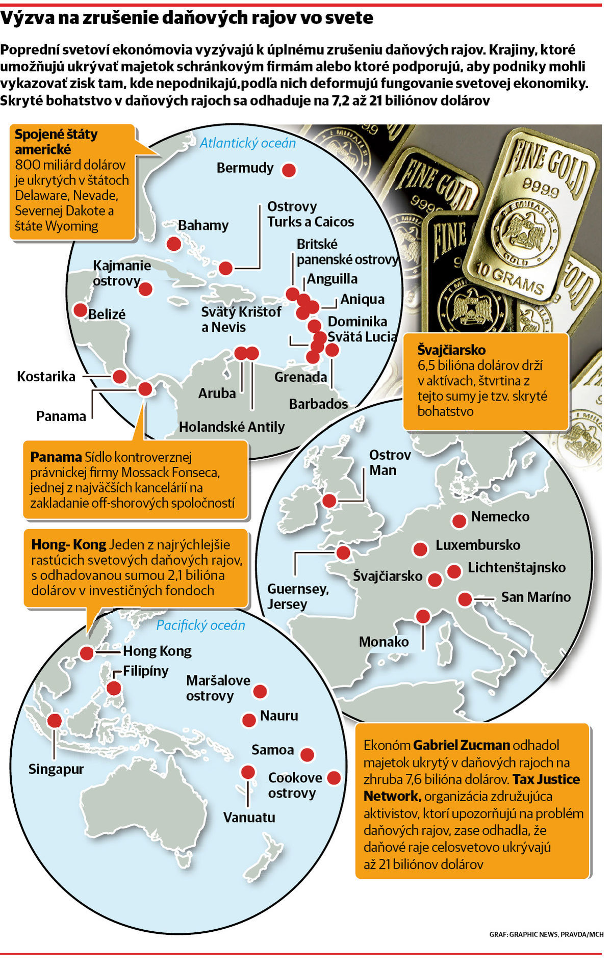 Podľa organizácie Tax Justice Network predstavuje skryté bohatstvo v daňových rajoch približne 21 biliónov dolárov. Na porovnanie, je to o štyri bilióny dolárov vyššia suma, ako za rok vyprodukuje najväčšia ekonomika sveta USA. Na ilustráciu, slovenská ekonomika by pri súčasnom výkone dané bohatstvo vytvorila asi za 250 rokov. Zlikvidovať daňové raje však nebude jednoduchý proces, vzhľadom na obrovský lobing firiem na tých najvyšších miestach svetovej politiky. Prvým krokom je úzka spolupráca pri výmene citlivých údajov. Vo štvrtok sa k iniciatíve sťažiť daňovým podvodníkom a zločincom snahu vyhnúť sa odhaleniu, pridali Kajmanie ostrovy, Jersey, Bermudy, Spojené arabské emiráty a Ostrov Man.