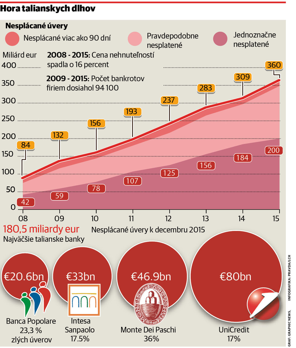 „Taliansky bankový systém ťažia okovy zlyhaných úverov v súhrnnej hodnote 400 miliárd eur, z ktorých je zhruba 75 percent nekrytých rezervami,“ povedal Peter Garnry, hlavný akciový stratég Saxo Bank. Vypuknutie katastrofy má termín 29. júla, keď Európska centrálna banka spustí stresové testy finančných domov a zverejnené výsledky môžu naplno odhaliť slabosť talianskych bánk. Nervozita na trhu zašla tak ďaleko, že akcie najväčšej talianskej banky UniCredit sa od začiatku roku prepadli o viac ako 60 percent a dosiahli hodnotu 1,8 eura za akciu. Stalo sa tak napriek tomu, že hospodársky výsledok finančného domu za prvé 3. mesiace roku 2016 dosiahol hodnotu 406 miliónov eur.