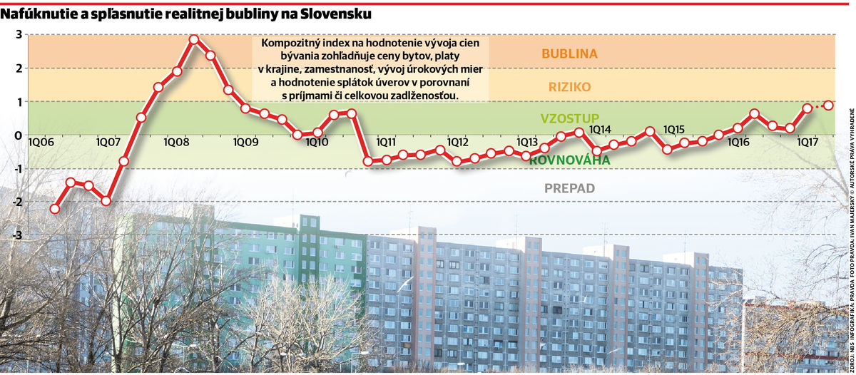 Rozdielna oproti predkrízovým časom je aj hodnota takzvaného kompozitného indexu na sledovanie vývoja priemernej ceny bývania. Výška indexu v súčasnosti totiž nenaznačuje realitnú bublinu. Aktuálne sme v pásme vzostupu, ktoré poukazuje na rast cien na realitnom trhu. V roku 2008, keď Slovenskom zmietal realitný boom, ju však index jasne signalizoval. Hodnoty kompozitného indexu môžu byť zaradené do piatich pásiem – prepad, rovnováha, vzostup, riziko, bublina.