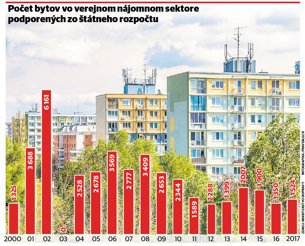 Ani toto číslo sa však nepodarilo po ďalšie roky prekonať. Počet dokončených obecných nájomných bytov klesol pred dvomi rokmi na 359. Dlhodobo sa podľa štatistiky ministerstva dopravy na Slovensku ročne dokončí okolo 15 000 bytov, zároveň je na Slovensku okolo 1,8 milióna obývaných bytov.